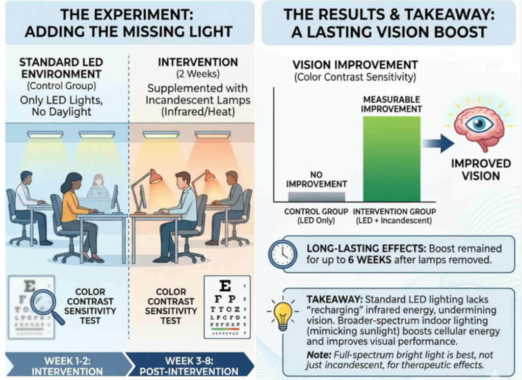 Standard LED lighting, while energy-efficient, may undermine human visual performance because it lacks the “recharging” energy of infrared light. Supplementing indoor lighting with broader spectra—similar to natural sunlight—boosts cellular energy in the retina and significantly improves vision.